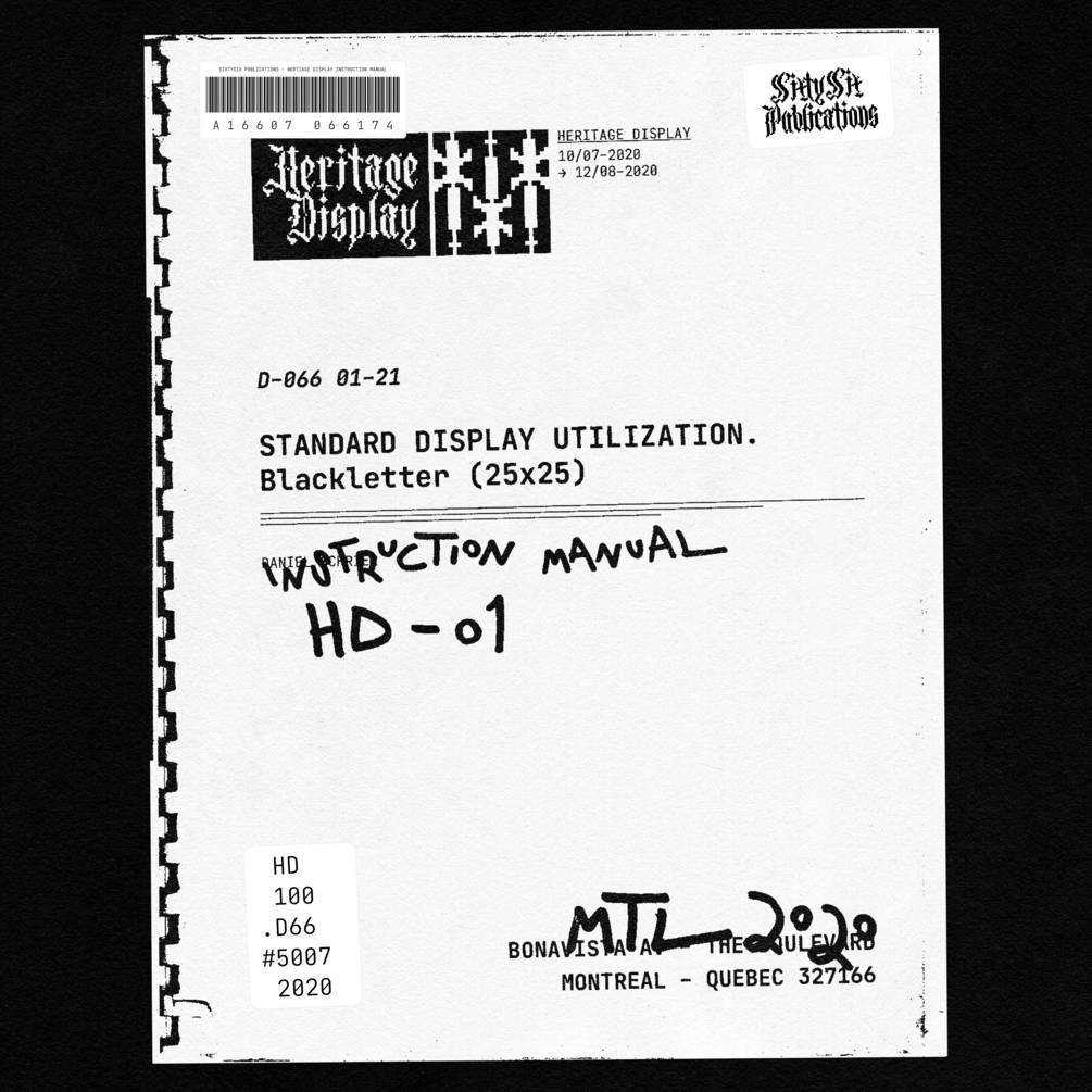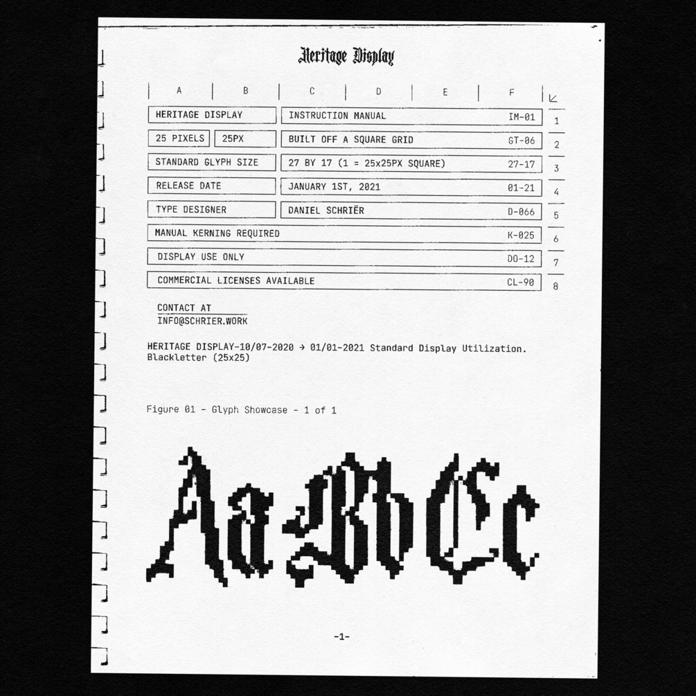 A2Z Heritage is a blackletter display typeface built on a 25x25 grid, each letter has strict constraints which led to a unique outcome when compared to a standard blackletter typeface. Heritage is based off of the cover of Emigre #14 published in 1990. This cover has set the tone for the entirety of this project. This typeface includes alternate letters as well as ornaments which can be placed on any letter. Heritage includes latin language support and alternate symbols which can be tailored to any project. A new version of Heritage will be released in 2023.