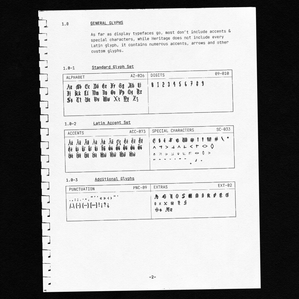 A2Z Heritage is a blackletter display typeface built on a 25x25 grid, each letter has strict constraints which led to a unique outcome when compared to a standard blackletter typeface. Heritage is based off of the cover of Emigre #14 published in 1990. This cover has set the tone for the entirety of this project. This typeface includes alternate letters as well as ornaments which can be placed on any letter. Heritage includes latin language support and alternate symbols which can be tailored to any project. A new version of Heritage will be released in 2023.